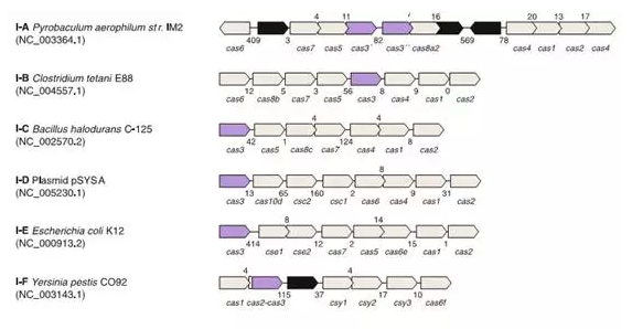 I 型CRISPR的標(biāo)簽基因是Cas3(紫色)。在不同的物種中,又將I 型細(xì)分為6個(gè)亞型(I-A-E),圖3。