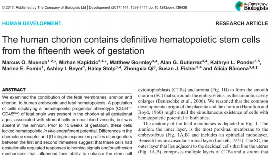 2017:從妊娠第15周開始胎盤絨毛膜就含有造血干細(xì)胞