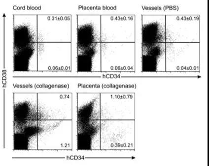 運(yùn)用流式細(xì)胞計數(shù)技術(shù)檢測臍血、胎盤血、血管、胎盤(膠原酶處理后)中造血干細(xì)胞(CD34+CD38-細(xì)胞)以及造血祖細(xì)胞(CD34+CD38+細(xì)胞)的含量。胎盤中含有1.1±0.79%的造血祖細(xì)胞,含有0.39±0.21%的造血干細(xì)胞。與之相比,臍帶血含有0.31±0.05%的造血祖細(xì)胞和0.06±0.01%的造血干細(xì)胞。胎盤血中含有0.43±0.16%的造血祖細(xì)胞和0.06±0.04%的造血干細(xì)胞?!猂obin C et al. Human placenta is a potent hematopoietic niche containing hematopoietic stem and progenitor cells throughout development. Cell stem cell.2009 2;5(4): 385-95.