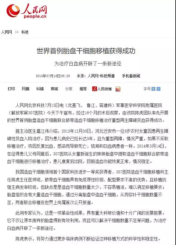 2015年7月16日,解放軍第307醫(yī)院陳虎教授團(tuán)隊(duì)宣布,經(jīng)過16個月的術(shù)后觀察,世界首例胎盤造血干細(xì)胞移植治療重型再生障礙貧血獲得成功。