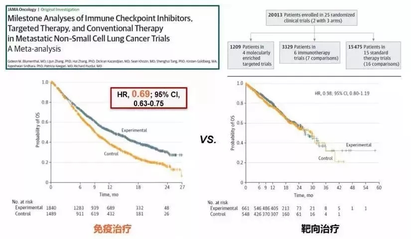 2017年,JAMA ONC曾經(jīng)發(fā)過一篇經(jīng)典文章,通過對非小細胞肺癌的25個臨床試驗,2萬多名患者的大數(shù)據(jù)分析,發(fā)現(xiàn)參與免疫療法和靶向療法的患者,生存曲線非常不同。