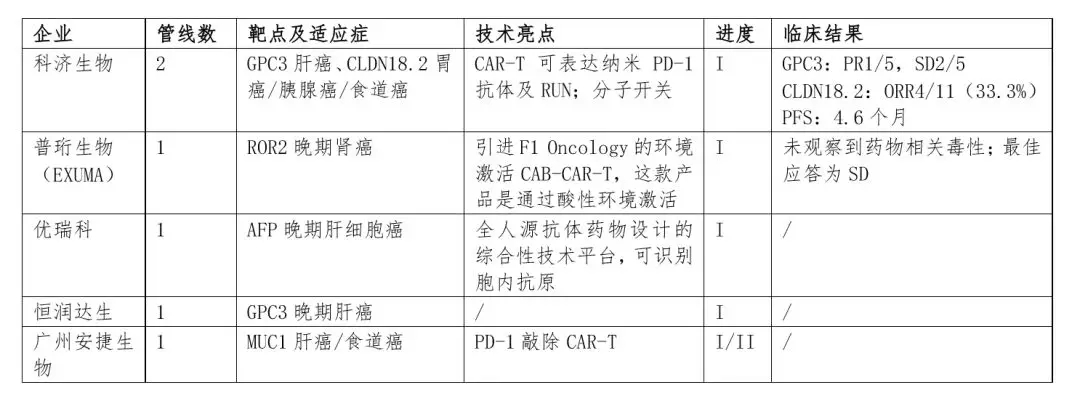 從上表來看,除了GPC3之外,其他蛋白抗原都存在與人體正常組織中,因此控制CAR-T的on-target毒性成為非常關(guān)鍵的因素。根據(jù)臨床推進(jìn)來看,可以關(guān)注MSLN,GPC3以及新型腫瘤特異性靶點(diǎn)在臨床上的進(jìn)展。