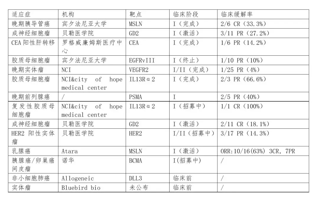 表5 國際上獲得實(shí)體瘤CAR-T臨床批件的機(jī)構(gòu)