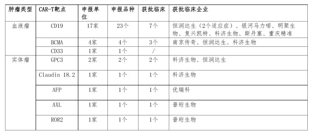 國內(nèi)無產(chǎn)品上市,大概20幾家企業(yè)申報(bào)臨床,約30個(gè)產(chǎn)品,其中11個(gè)產(chǎn)品獲批臨床,國內(nèi)CAR-T研發(fā)特點(diǎn):