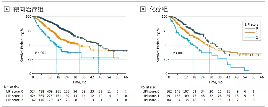 b. 靶向治療:LIPI評分越低,生存期越長,也差三倍