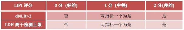 LIPI是綜合了兩個血液檢查指標:dNLR(中性粒細胞/淋巴細胞百分比)和LDH(乳酸脫氫酶)。具體的計算方法也非常簡單:如果dNLR大于3同時LDH高于檢測上限,得分是2,預后較差;如果dNLR小于3,同時LDH不高于上限,得分是0,預后較好;中間狀態(tài)得分是1,屬于中等水平。如下圖所示: