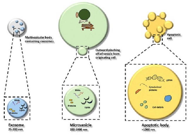 外泌體的電鏡是鑒定外泌體形態(tài)大小的一個(gè)常規(guī)手段,電鏡下呈典型的杯狀形態(tài)。細(xì)胞外囊泡 (extracellular vesicles, EVs)是機(jī)體遠(yuǎn)距離細(xì)胞間交流的一種手段。目前主要被分為3大類:外泌體、微囊泡和凋亡小體,臨床研究中主要關(guān)注的是外泌體。外泌體(直徑30~150nm,富含RNA和蛋白質(zhì)),再大的就屬于微囊泡(直徑100~350nm,富含金屬蛋白酶和磷脂酰絲氨酸),再大就是凋亡小體(500~1000nm,富含組蛋白)了,由細(xì)胞凋亡產(chǎn)生。