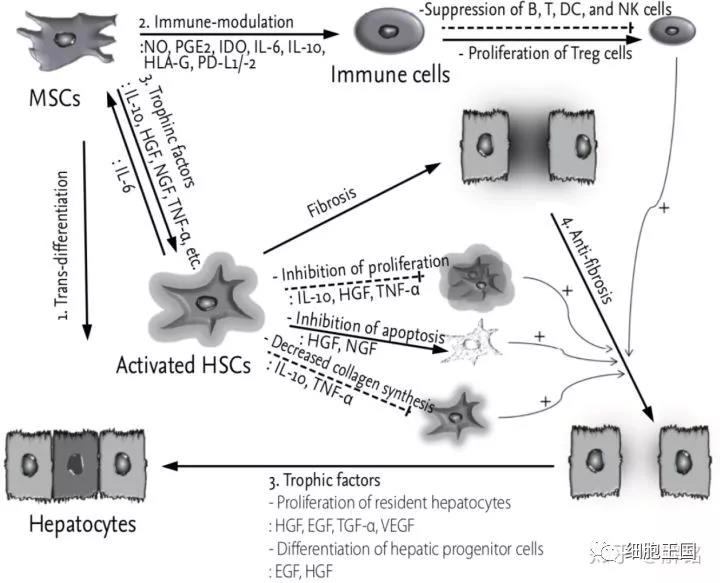研究證實,間充質(zhì)干細胞(MSC)治療肝硬化的原理除了細胞分化外,更傾向于旁分泌作用?,F(xiàn)在在肝病領(lǐng)域的得到很多研究者承認的是,MSC歸巢到肝部后,細胞分化進行組織修復(fù)的能力并不高,MSC轉(zhuǎn)分化成肝細胞樣細胞的效率很低(中間牽扯MSC的狀態(tài)、分化效率、微環(huán)境以及免疫各種因素),但是MSC的旁分泌機制對肝功的恢復(fù)真的具有積極作用。具體作用可解釋如圖: