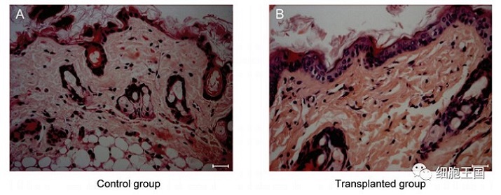 對照組皮膚表皮各層界限不清楚,真皮層成纖維細胞數(shù)量減少,膠原纖維變細,毛囊數(shù)明顯減少,皮下脂肪層變??;干細胞移植組表皮組織結(jié)構(gòu)相對較完整,細胞分層較清晰。