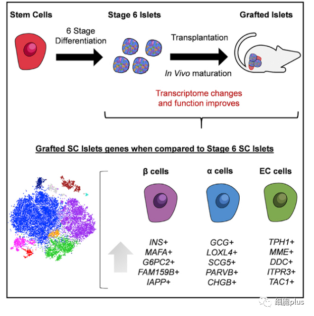 研究表明移植的PEC-01細(xì)胞產(chǎn)生胰島素(藍(lán)色)、胰高血糖素(紅色)和生長抑素(綠色)。