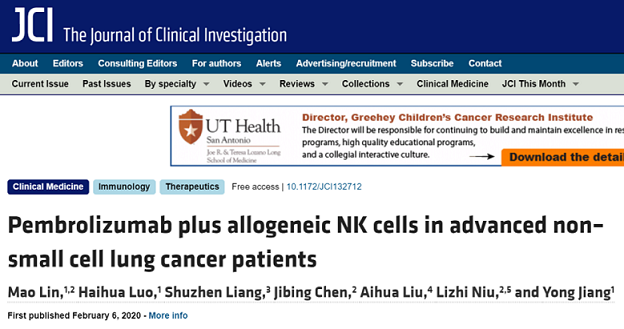 2020年5月,這個設(shè)想由國內(nèi)的研究團(tuán)隊(duì)率先實(shí)錘,證實(shí)PD-1(派姆單抗,K藥)加同種異體NK細(xì)胞在先前接受過治療的晚期NSCLC患者中安全有效。并發(fā)表在國際頂級期刊《The Journal of Clinical Investigation》上。