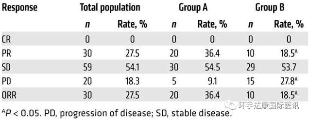 A組的總客觀緩解率(ORR)為36.5%,明顯優(yōu)于B組的18.5%。