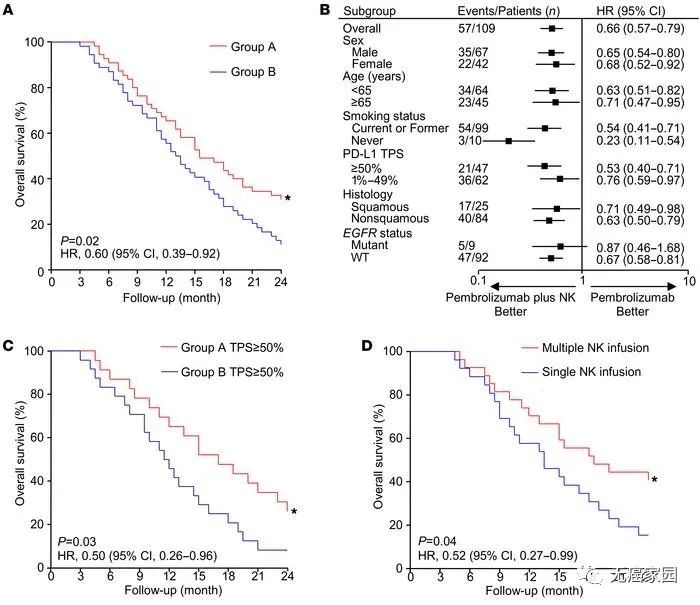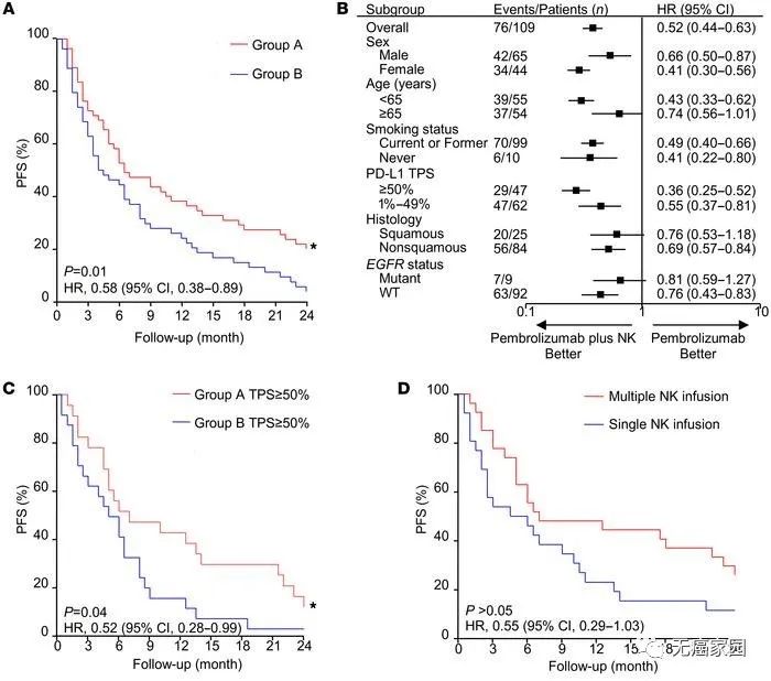 在PD-L1 ≥50%的患者中,A組患者的中位OS為17.0個月,比B組患者的中位OS更長(圖C)。此外,接受多療程N(yùn)K細(xì)胞輸注的患者的中位OS明顯長于僅接受單療程N(yùn)K細(xì)胞輸注的患者(圖D)