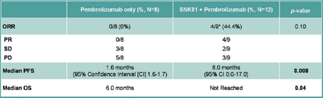 這項(xiàng)研究納入了20例IV期非小細(xì)胞肺癌(PD-L1 +,EGFR-,ALK-),這些患者接受了一線鉑類治療并失敗了,隨機(jī)分配至兩組:A組接受PD-1(派姆單抗)+SNK01治療(每六周2 x 10?或4 x 10?個細(xì)胞)B組患者僅接受派姆單抗,在21天周期的第1天注射。