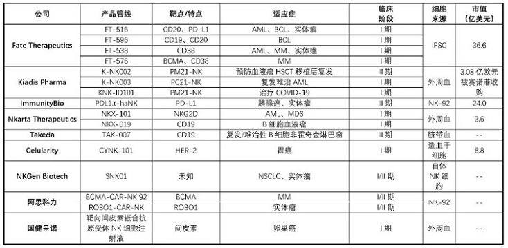2021年,NMPA先后批準(zhǔn)兩款CAR-T療法上市,極大鼓舞了國內(nèi)細(xì)胞治療企業(yè)。多家企業(yè)產(chǎn)品進(jìn)入IIT臨床研究階段,其中國健呈諾的CAR-NK產(chǎn)品已獲得IND批件,另有多家主要從事CAR-T療法開發(fā)的公司(如科濟(jì)生物、恒潤達(dá)生、博生吉等)也有CAR-NK管線的布局。加科思藥業(yè)通過投資Hebecell,百濟(jì)神州通過與Shoreline Biosciences達(dá)成戰(zhàn)略合作也都快速實(shí)現(xiàn)在該領(lǐng)域的布局。[表2]