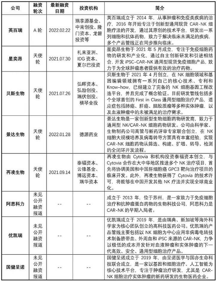 國內(nèi)CAR-NK企業(yè)融資進(jìn)展(數(shù)據(jù)來源:啟信寶; 康橙投資)