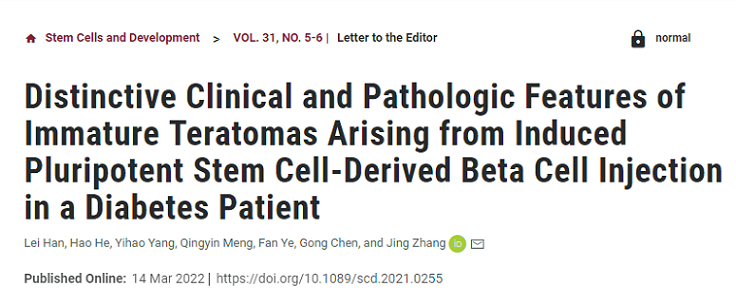 參考資料:Han L, He H, Yang Y, Meng Q, Ye F, Chen G, Zhang J. Distinctive Clinical and Pathologic Features of Immature Teratomas Arising from Induced Pluripotent Stem Cell-Derived Beta Cell Injection in a Diabetes Patient. Stem Cells Dev. 2022 Mar;31(5-6):97-101. doi: 10.1089/scd.2021.0255. Epub 2022 Feb 4. PMID: 35018826.(以上內(nèi)容僅供學(xué)術(shù)探討)