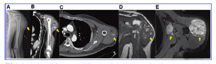 接受iPS細(xì)胞治療患者的畸胎瘤。(A) 在左上臂的三角肌中,觀察到一個圓形的混合密度腫塊,邊界不清,為9.6±5.2cm。(B) CT冠狀掃描顯示三角肌內(nèi)有一圓形混合密度腫塊,邊界不清。(C)增強(qiáng)CT軸向掃描顯示不均勻和中度強(qiáng)化。(D)MRI T1W以等信號為主,有不規(guī)則的高低信號區(qū)。(E) T2W也顯示高信號和斑片狀低信號區(qū),左腋窩有多個淋巴結(jié)腫大。